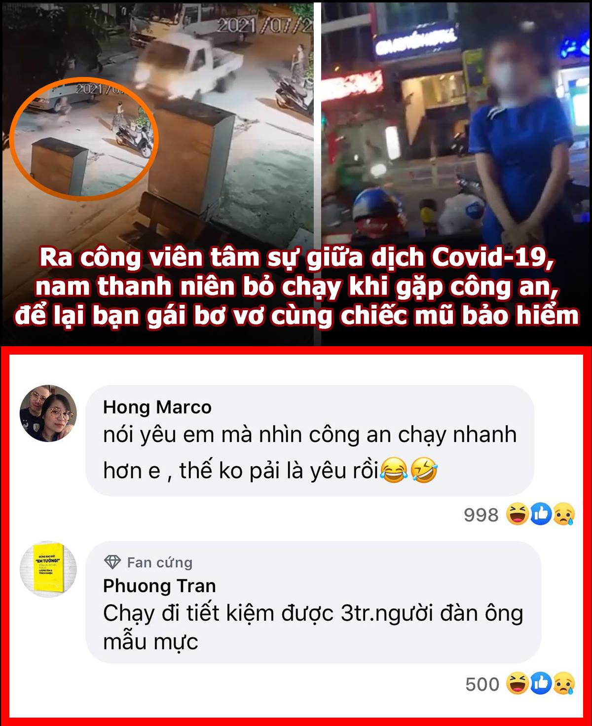 Đoạn clip ghi lại hình ảnh cô gái đứng bơ vơ giữa công viên, đang được lực lượng chức năng yêu cầu làm việc khi ra ngoài công cộng trong thời điểm dịch bệnh. Thanh niên đang tâm sự cùng với cô gái khi vừa nhìn thấy bóng dáng công an đã vội chạy, "bỏ quên" bạn gái của mình.