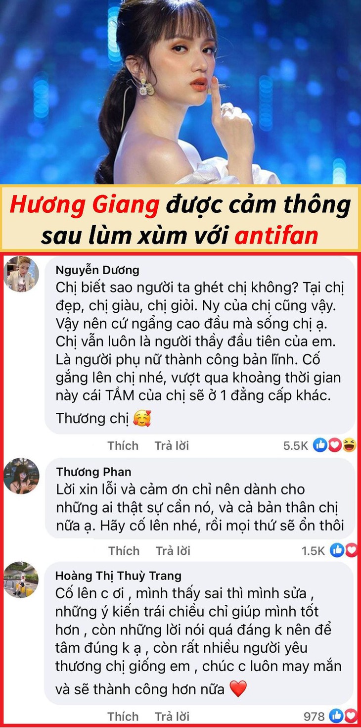 Sau lùm xùm với anti-fan, Hương Giang đăng đàn xin lỗi vì để xảy ra sự việc theo chiều hướng tiêu cực. Bên cạnh những lời phản đối, vẫn còn rất nhiều người ủng hộ, động viên nàng hậu.