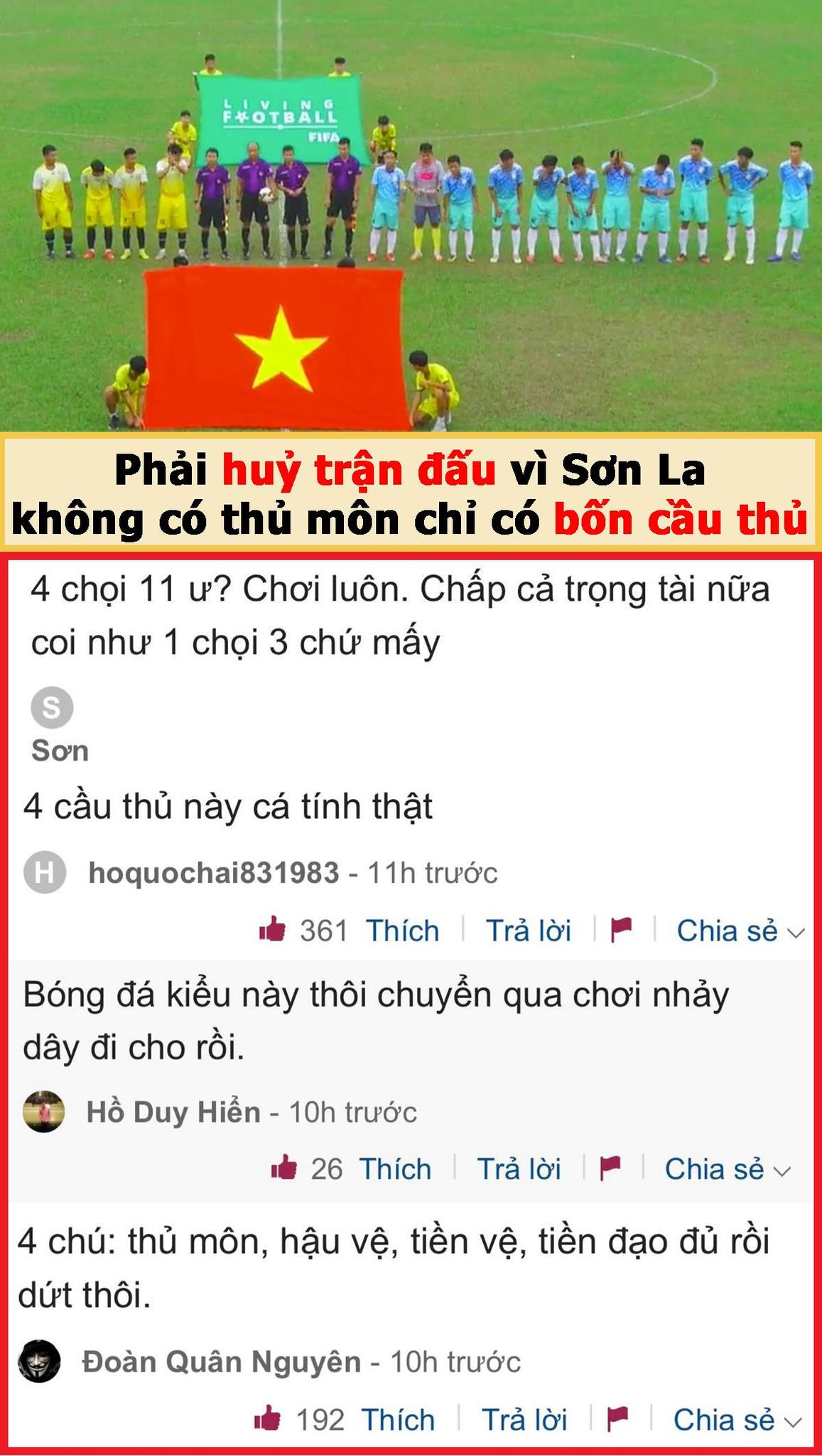 Chiều ngày 6/11, trận đấu giữa Sơn La và Luxury Hạ Long ở giải hạng Ba đã không thể diễn ra như dự kiến. Đội Sơn La tham dự chỉ với 4 cầu thủ đủ điều kiện ra sân, dù đăng ký đến 20 người. Thậm chí, đội hình ra sân còn chẳng có thủ môn. Theo điều lệ, mỗi đội phải có ít nhất 7 cầu thủ thì mới hợp lệ để trận đấu được diễn ra.