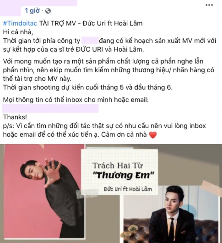 Người quản lý này đăng đàn kêu gọi đối tác tài trợ cùng kết hợp và sản xuất sản phẩm âm nhạc mang tên Trách hai từ thương em do Hoài Lâm cùng nam ca sĩ Đức Uri song ca.