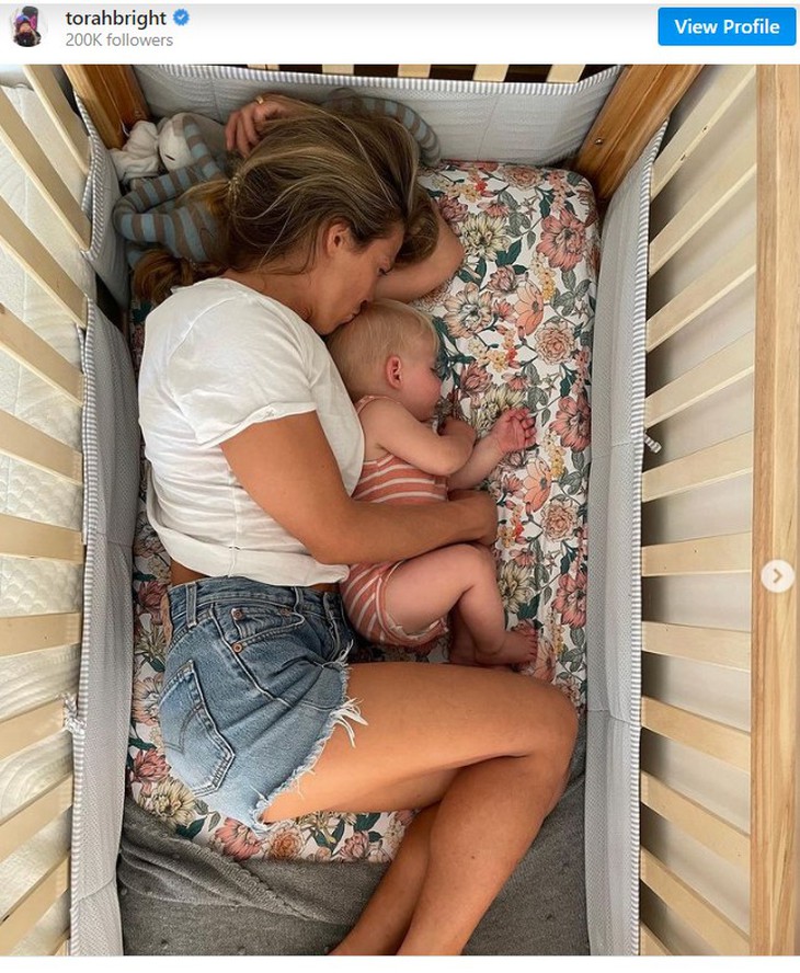 Hai mẹ con chị Torah Bright nằm ngủ bên nhau - Ảnh: Instagram/Torah Bright