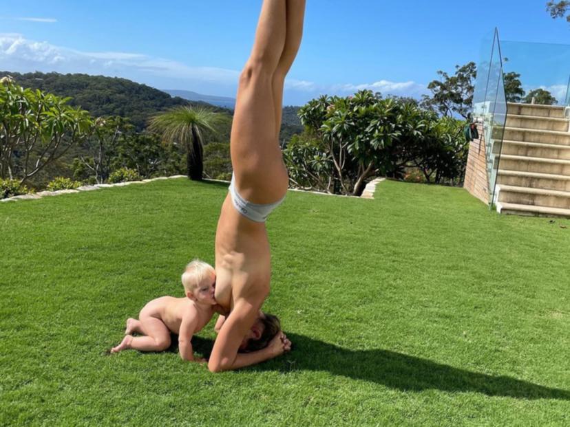 Chị Torah Bright trồng chuối trong khi cho con bú - Ảnh: Instagram/Torah Bright