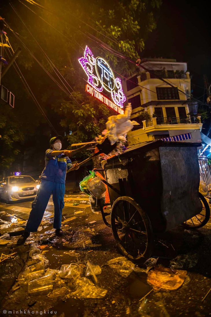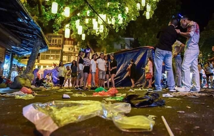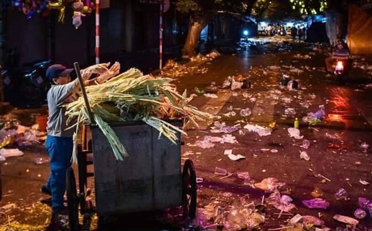 Càng nhiều rác, người công nhân vệ sinh môi trường lại càng phải "nai lưng" ra dọn dẹp.Tại những con phố ở trung tâm, nhiều người tìm đến không chỉ với tâm trạng háo hức chờ đón một đêm hội mà còn luôn sẵn sàng mang theo một tâm hồn ăn uống thường trực khi "tay xách nách mang" nào đồ ăn, nào thức uống. Thế nhưng khi dùng xong, phần còn lại là những túi ni-lon, những chiếc que xiên hay giấy gói nhanh chóng được... tiện tay vứt tại chỗ, thay vì bỏ rác đúng nơi quy định.