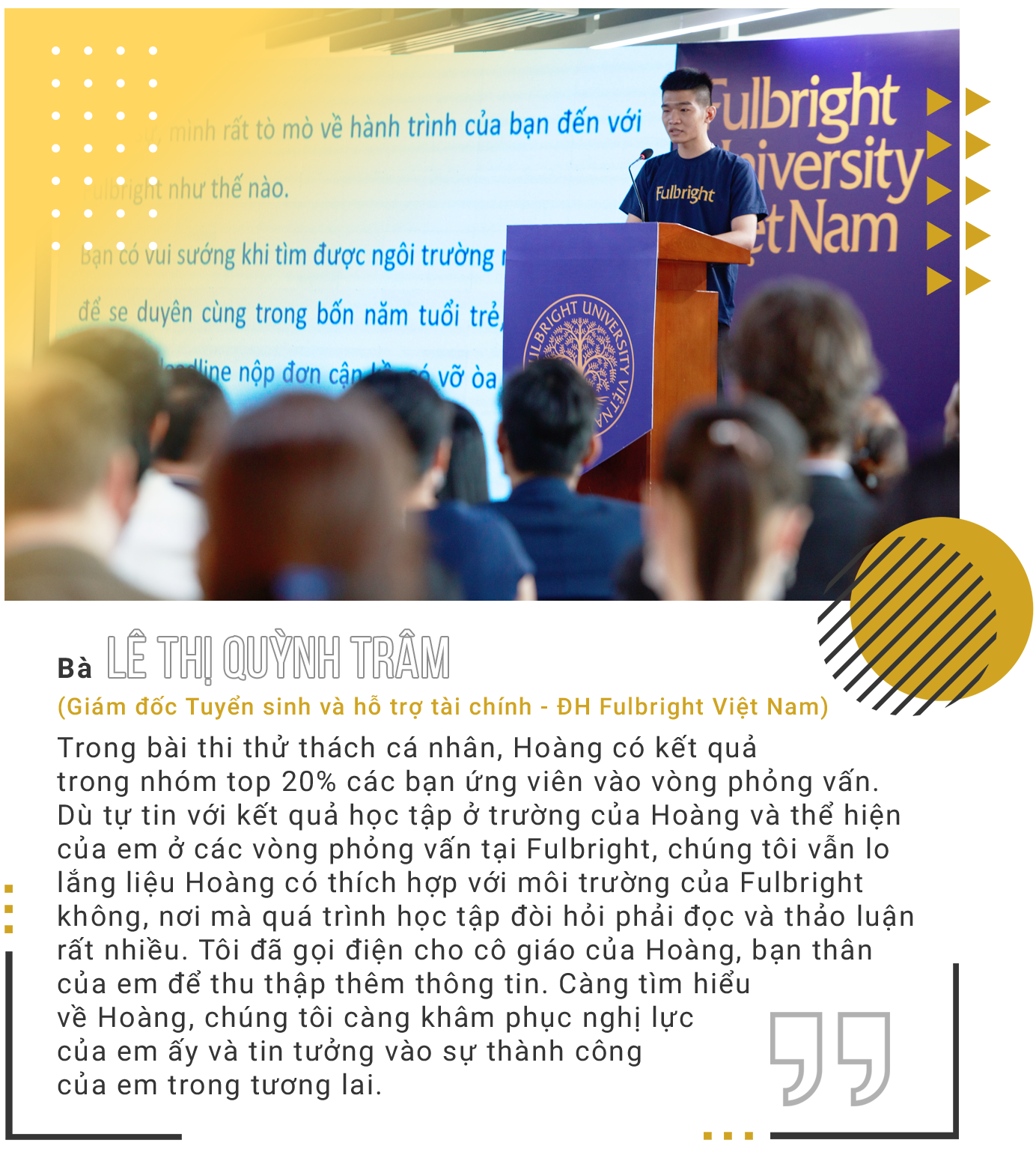 Trong lúc tìm kiếm cơ hội học đại học, Hoàng được khuyên nên ứng tuyển vào ĐH Fulbright Việt Nam. Với Hoàng, đó là một trường hoàn toàn xa lạ, lại dạy bằng tiếng Anh trong khi vốn liếng tiếng Anh của Hoàng có gì đâu. Chần chừ mãi, Hoàng gửi hồ sơ ứng tuyển trước thời hạn cuối chỉ 3 phút.