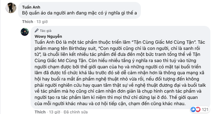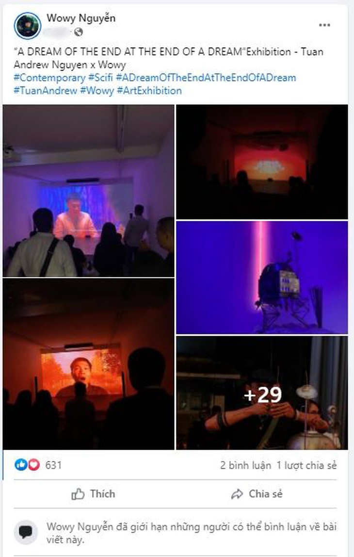 Mặc dù, công khai các thông tin về triển lãm trên trang cá nhân, nhưng Wowy không đăng tải hình ảnh bộ vest gây tranh cãi, đồng thời giới hạn người có thể bình luận bài viết của mình.