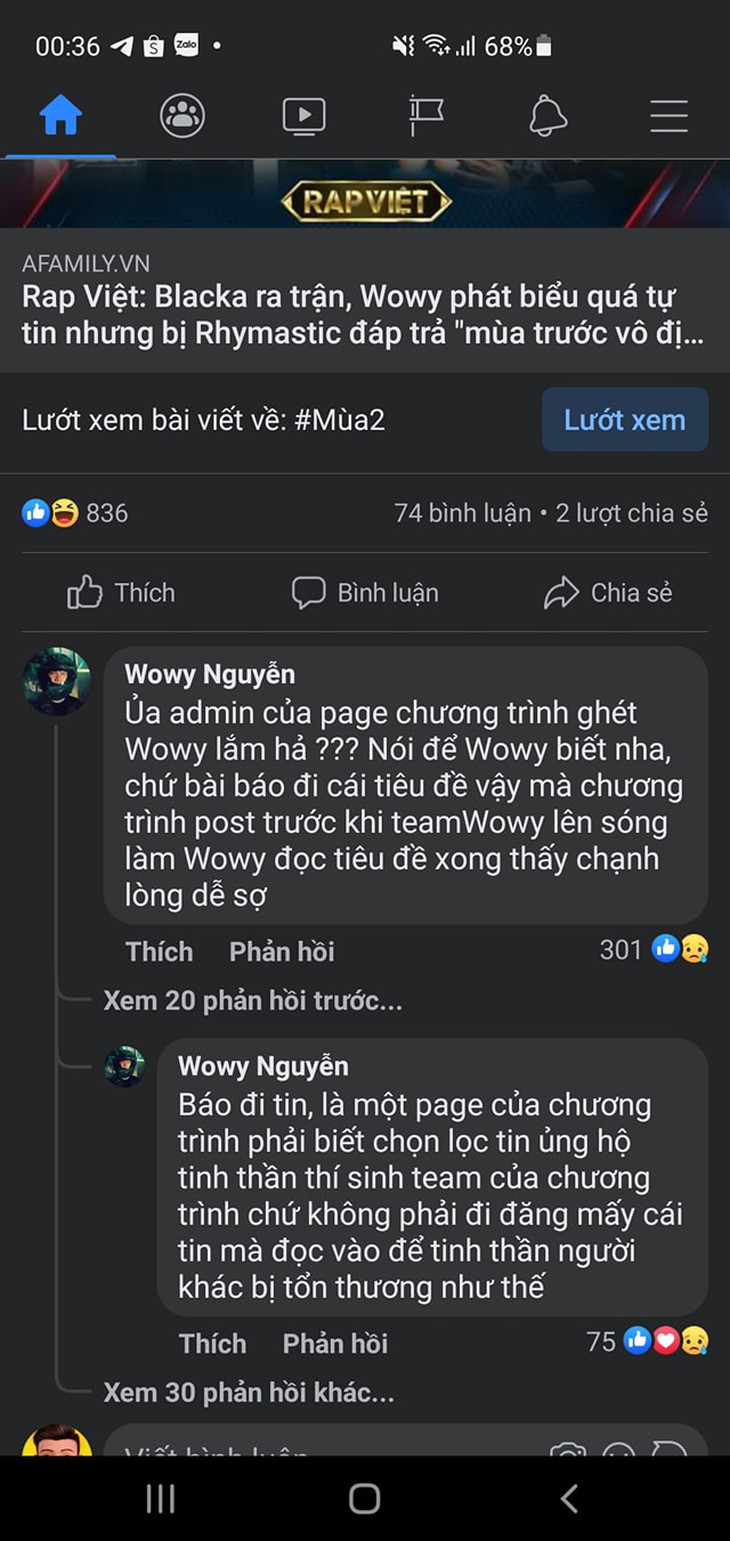 Huấn luyện viên Wowy và các học trò Rap Việt mùa 2.Theo đó, Wowy đã để lại bình luận dưới một bài đăng với giọng điệu gay gắt và thẳng thắn. Nam rapper nói: “Ủa, admin chương trình ghét Wowy lắm hả? Nói để Wowy biết nha chứ bài báo đi cái tiêu đề vậy mà chương trình post lên trước khi team Wowy lên sóng làm Wowy đọc xong, thấy chạnh lòng dễ sợ”.