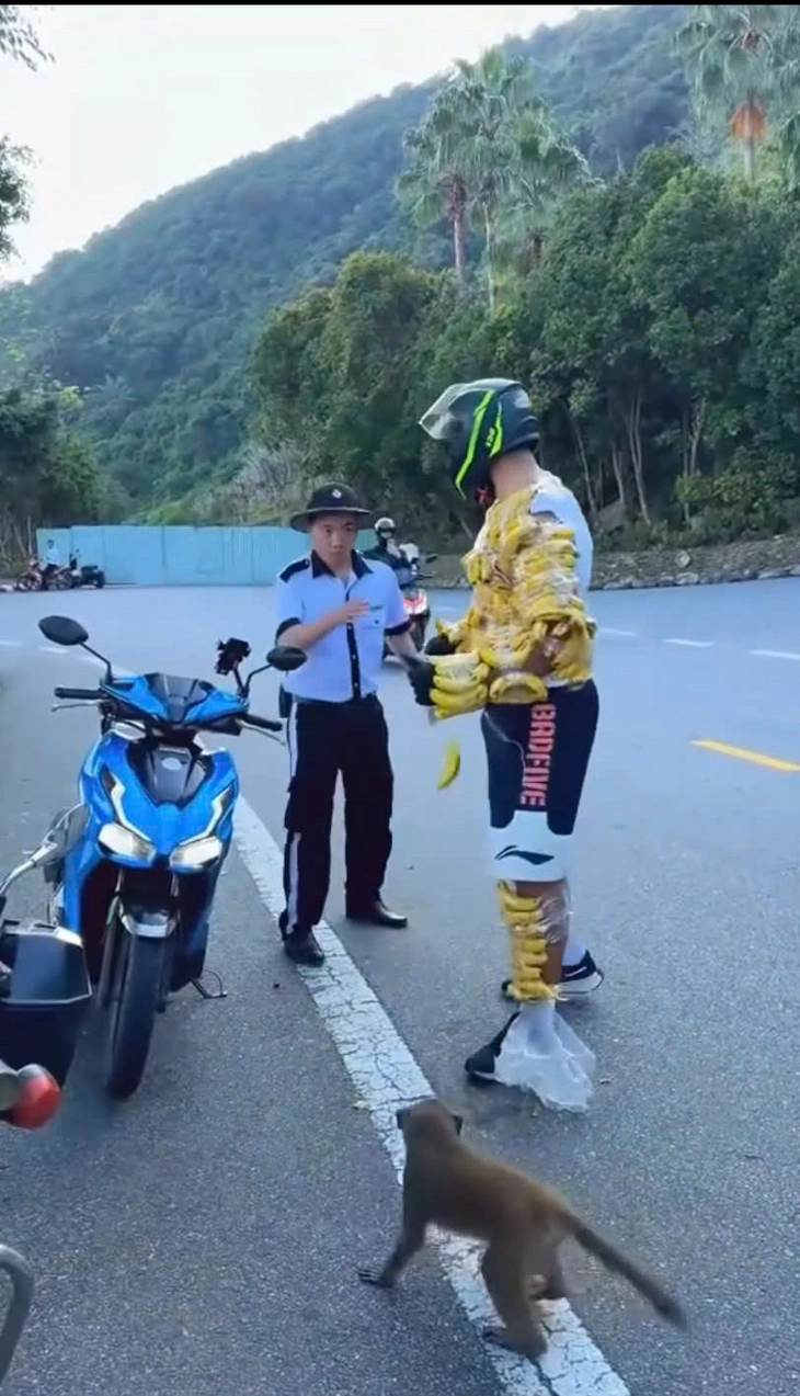 Theo đó, mạng xã hội xuất hiện clip một người nước ngoài quấn quanh bụng, chân, tay những quả chuối chín vàng tới khu vực khỉ hoang dã trên núi Sơn Trà đang sinh sống.
