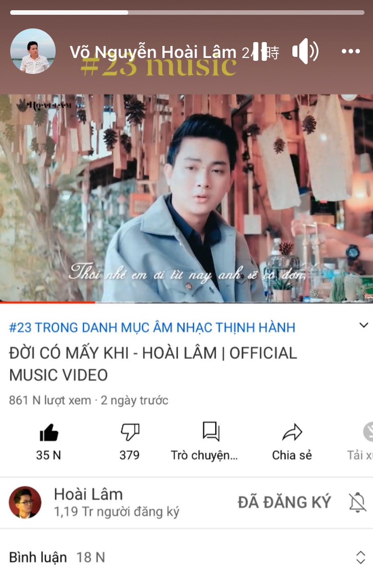 Điều duy nhất Hoài Lâm chia sẻ cách đây vài giờ là hình ảnh MV Đời có mấy khi, một ca khúc mới của anh đang chễm chệ ở top 23 trên tab thịnh hành của YouTube.
