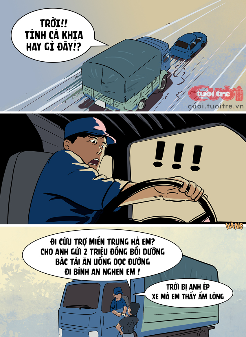Tài xế này cho biết, khi đang lái xe tải chở hàng cứu trợ bỗng có một chiếc xe hơi ép đầu xe bắt dừng lại. Sau đó người lái xe hơi bước xuống và nói "Đi cứu trợ miền Trung hả em? Cho anh gửi 2 triệu đồng bồi dưỡng bác tài ăn uống dọc đường, đi bình an nghen em!", khiến tài xế thấy bất ngờ và thật ấm lòng.