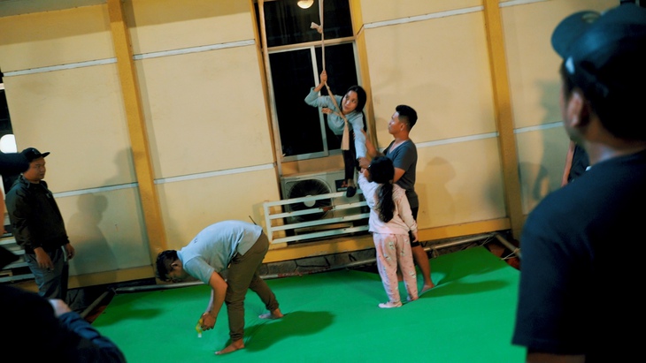 Trước khi quay, đạo diễn Lý Hải bàn bạc với đạo diễn hình ảnh Cường C.U kết hợp với Hoàng kỹ xảo để tính toán cách đánh đèn, vị trí đặt phông xanh sao cho lúc lột phông key ra có thể vẽ sâu thêm giống như nhân vật đang đu dây xuống từ lầu năm một cách chân thật nhất.