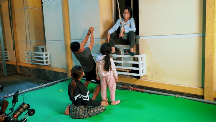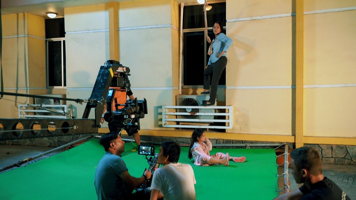 Về phía Bảo Thi, dù tuổi còn khá nhỏ nhưng bé có phong thái làm việc rất chuyên nghiệp. Bé chia sẻ thấy thoải mái và tự tin khi quay cảnh đu dây vì ở phía dưới đã được lót thảm dày, dây an toàn cũng luôn được thắt chặt trong suốt quá trình quay.