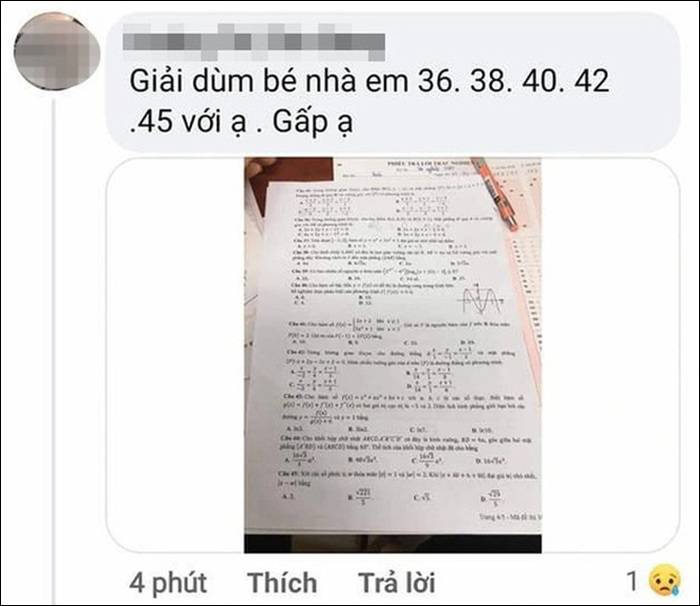 Sự việc này xảy ra tại điểm thi THPT Lệ Thủy, tỉnh Quảng Bình vào chiều ngày 8-7. Khi chỉ còn 5 phút kết thúc bài thi, lúc 15h55 phút - thí sinh này đã chụp lại đề Toán để gửi cho người thân. Tận lực hỗ trợ "đồng đội", người thân này đã nhanh nhảu đăng ngay lên mạng xã hội và nhờ dân mạng giải giúp "bé nhà em".