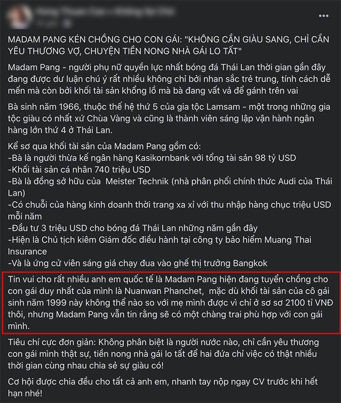Thông tin "tuyển chồng" cho con gái của Madam Pang thu hút sự chú ý của cư dân mạng. (Ảnh chụp màn hình)Được biết, con gái của Madam Pang tên là Nuanwan Phanchet (sinh năm 1999). Cô từng theo học tại ĐH Queensland (Úc) và lấy bằng tâm lý học của ĐH Chulalongkorn (Thái Lan), ngôi trường có bề dày lịch sử lâu đời bậc nhất Thái Lan, cũng là nơi Madam Pang từng theo học. Sinh ra ở vạch đích, Nuanwan sở hữu khối tài sản cũng không phải "dạng vừa" khi lên đến hàng ngàn tỉ đồng. Tuy nhiên, cô chọn phong cách sống giản dị, chỉ thường "khoe" hình ảnh đời thường nhẹ nhàng của mình, thay vì những chiếc siêu xe, đồng hồ đắt tiền như bao "rich kids" khác.