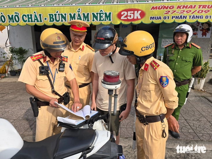 Đội Cảnh sát giao thông Rạch Chiếc lập biên bản anh T.T.Q. để xe máy trên vỉa hè - Ảnh: MINH HÒA