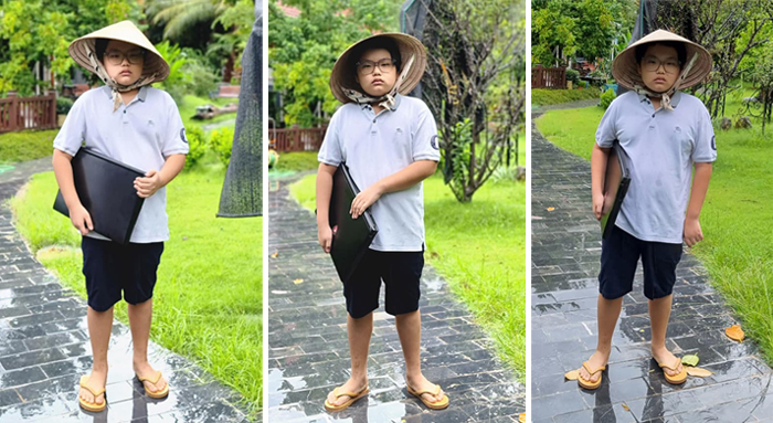 Bi Béo giật spotlight của anh trai với gương mặt không thể hài hơn được nữa trong ngày tựu trường.Anh cũng tiết lộ thêm, cả hai cậu con trai đã chuẩn bị sẵn sách vở và vô cùng hào hứng từ đêm trước. Tuy nhiên, sáng nay phải dậy sớm và trời mưa, nên "nhìn mặt thế kia thôi chứ trả lời phỏng vấn chẳng quên cà khịa".