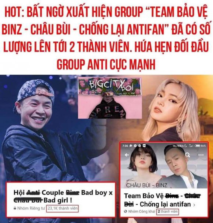 Chỉ vì thường xuyên thả thính mà Binz và Châu Bùi có hẳn group antiThời gian gần đây, làn sóng anti-fan trỗi dậy mạnh mẽ tấn công nghệ sĩ bằng nhiều cách. Họ lập thành group để hợp sức tẩy chay nghệ sĩ mà họ ghét. Điển hình những cái tên gặp phải rắc rối đau đầu vì anti-fan có thể kể đến là: Hoa hậu Hương Giang, diễn viên Lâm Vỹ Dạ, diễn viên Lan Ngọc... Và đối tượng mới nhất là cặp đôi Binz và Châu Bùi.
